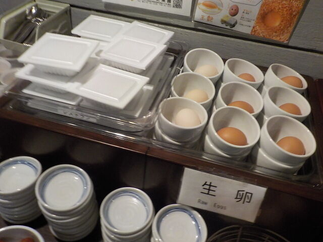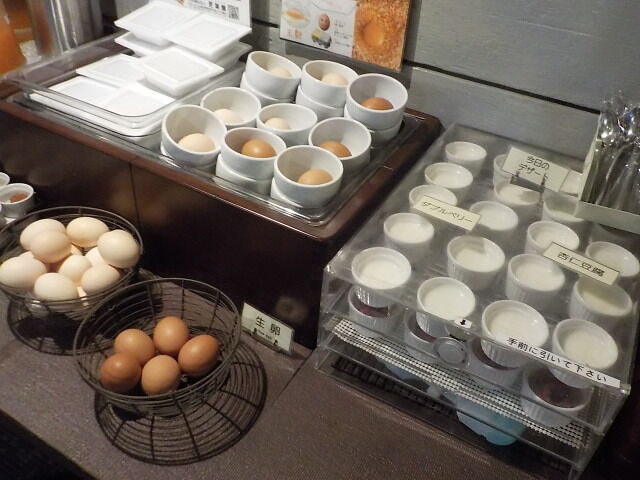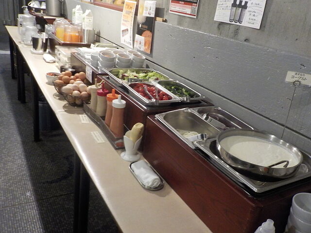 ビュッフェコーナーには、コーヒーメーカー、ドリンク、サラダ、卵、納豆などあり。