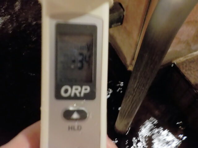 2025/1/19、15時00分~10分、浴槽内でORP計測(湯口はミニボトルで採水)。源泉100%かけ流しで、塩素系薬剤未使用。