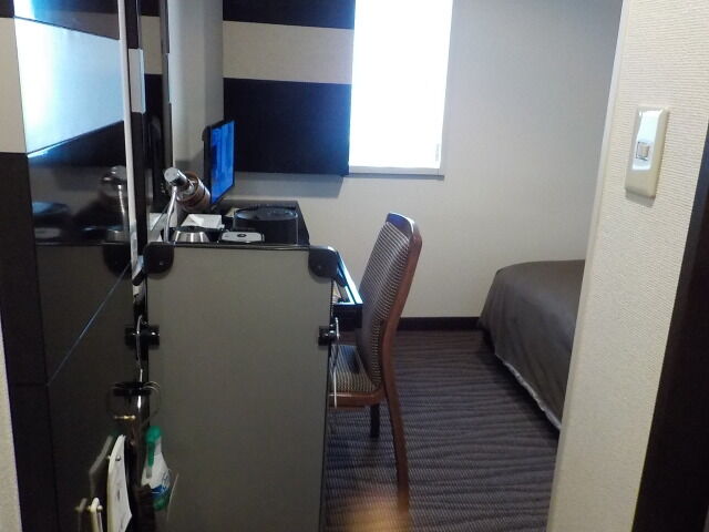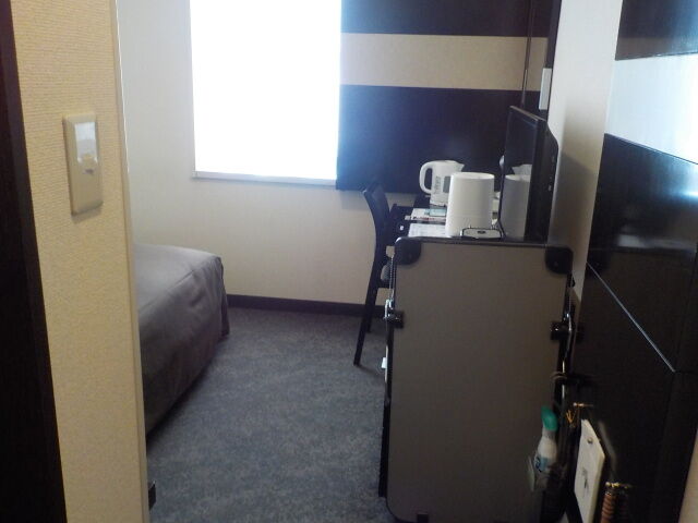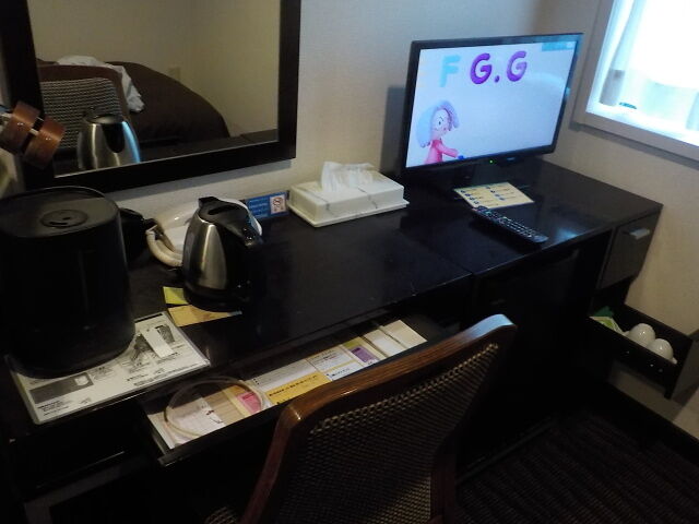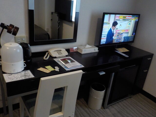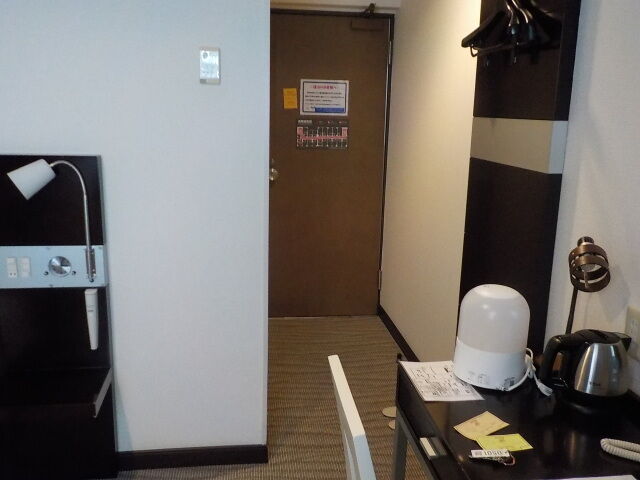 案内されたのは5階シングル禁煙室。無料Wi-Fi利用可。お茶パックはロビー前に置いている。