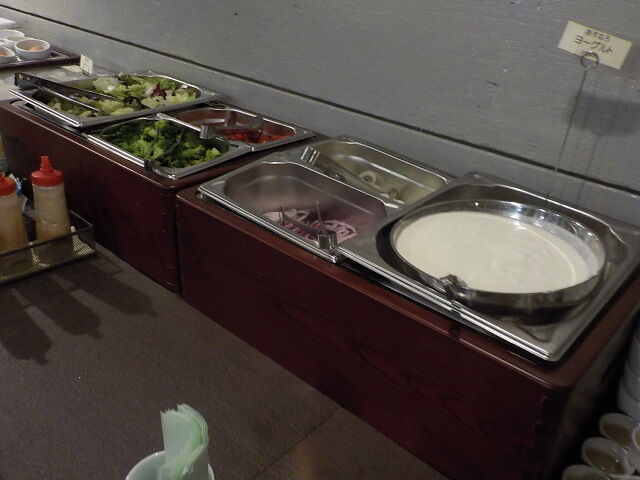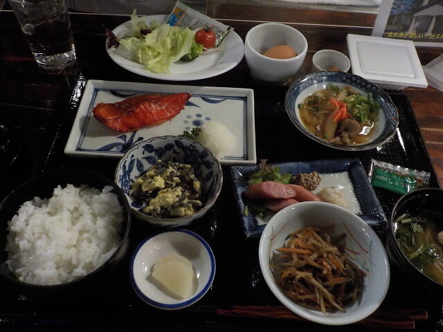 和定食で注文。焼魚、牛肉野菜煮込み、きんぴら、ウインナー、昆布の卵とじ、ご飯、味噌汁、漬物。ビュッフェコーナーより→サラダ、卵、納豆、梅干。ご飯おかわり自由。