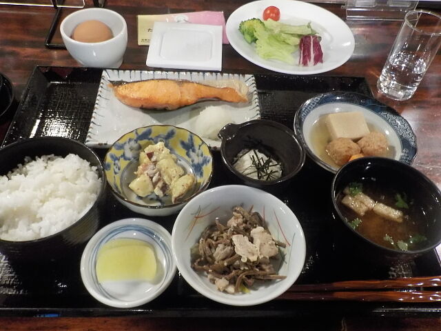 和定食で注文。鮭の塩焼き、鶏だんご、さつま芋のサラダ、わらびの煮物、長いも千切り、ご飯、味噌汁、漬物。ビュッフェより→サラダ、卵、納豆。ご飯のおかわり自由。