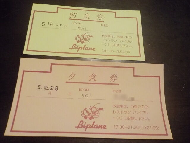 食事は2階のレストラン「バイプレーン」でとる。夕食は17時~21時、朝食は6時30分~10時。夕食はチェックイン時に希望時間指定有り。