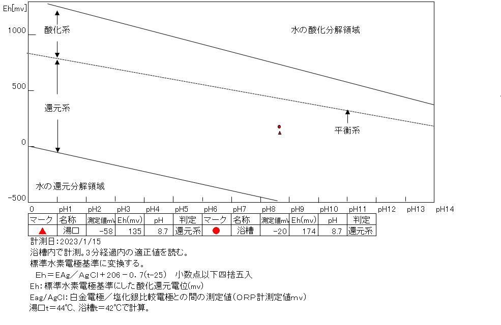 湯口:温度44.3℃、pH8.70、ORP値は-58mvに収束した。