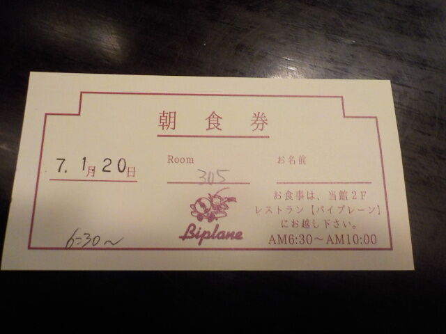 チェックイン時に希望時間指定有り。チェックイン時に貰った朝食券を提出。