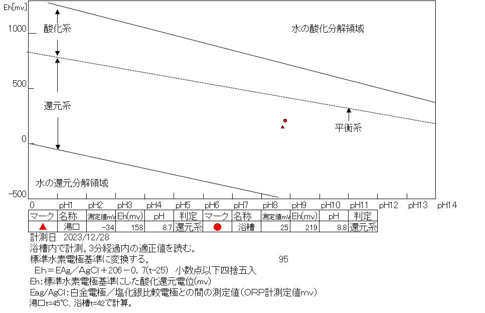 浴槽:温度41.7℃、pH8.76、ORP値は25mvに収束した。