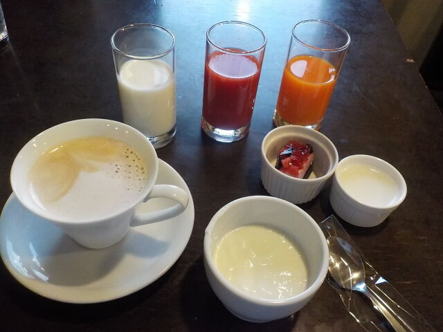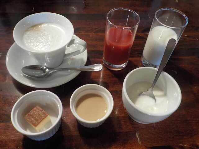ケーキ、プリン、ヨーグルト、牛乳、野菜ジュース、コーヒー