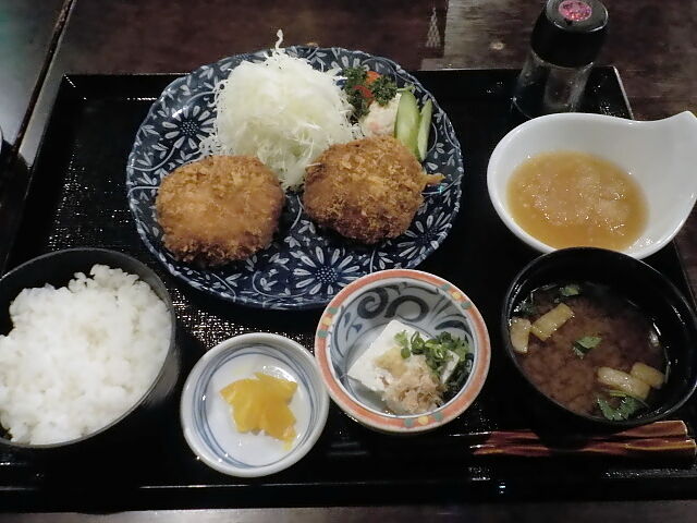 空飛ぶメンチカツ定食(1,300円)を注文。メンチカツ(サラダ付)、ご飯、味噌汁、冷奴、おろしタレ、漬物。