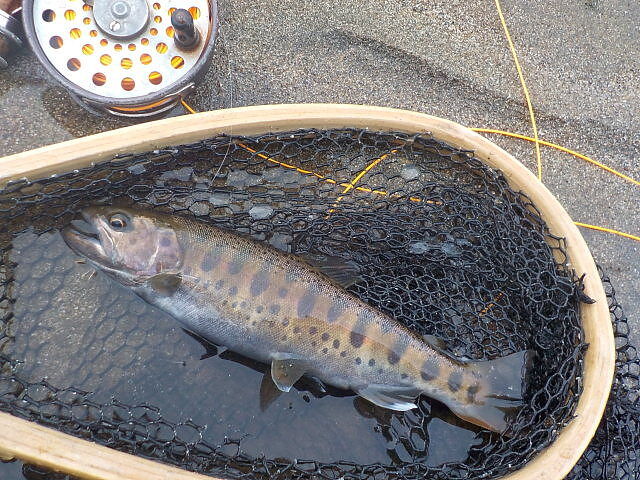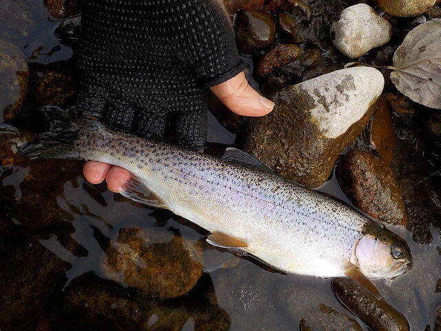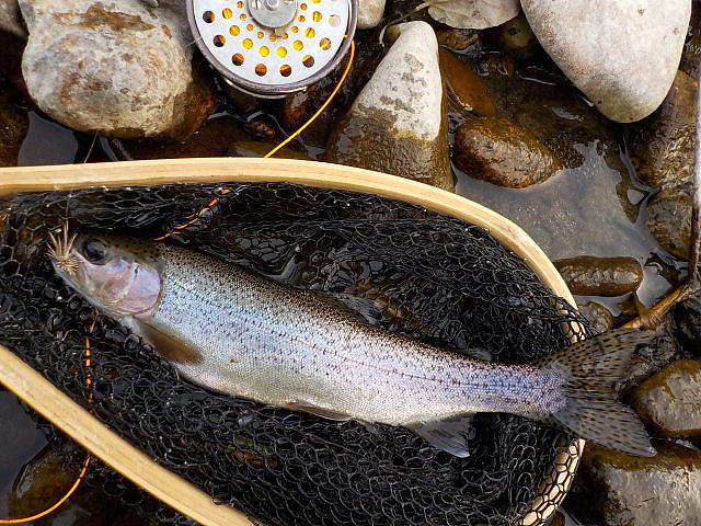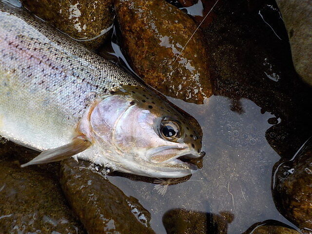 放置されたブロック石で水流がゆるやかになったタルミに毛鉤を振ると、猛然と27cmの虹鱒が食らいついた。