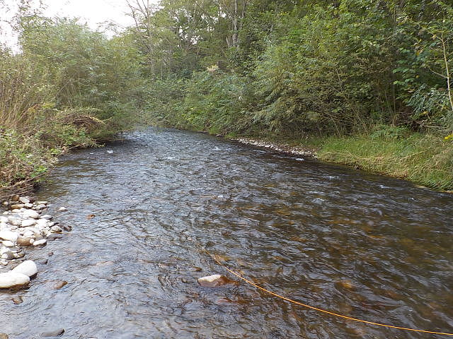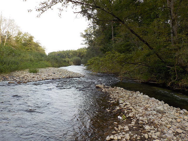 右岸から支流の久山川が合流し深場になっている。15時40分頃はさっぱりだったが、17時過ぎに毛鉤を振ると、20cmのヤマメと21cmの虹鱒がヒットした。