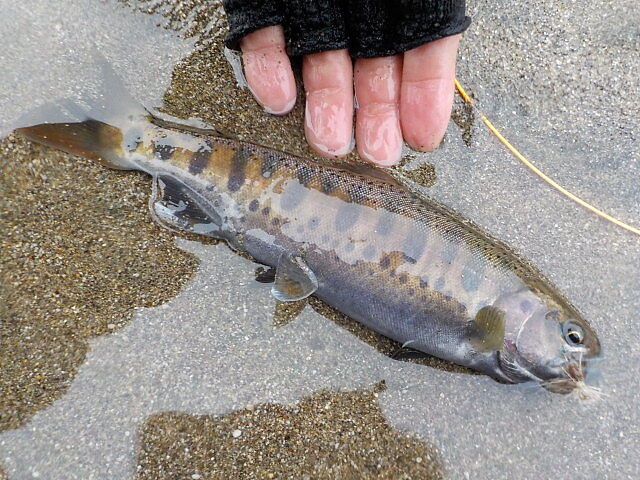 虹鱒3尾(27cm、21cm、20cm)キャッチ&リリース。画像は27cmの虹鱒。