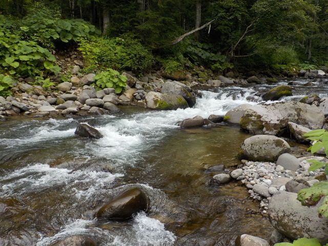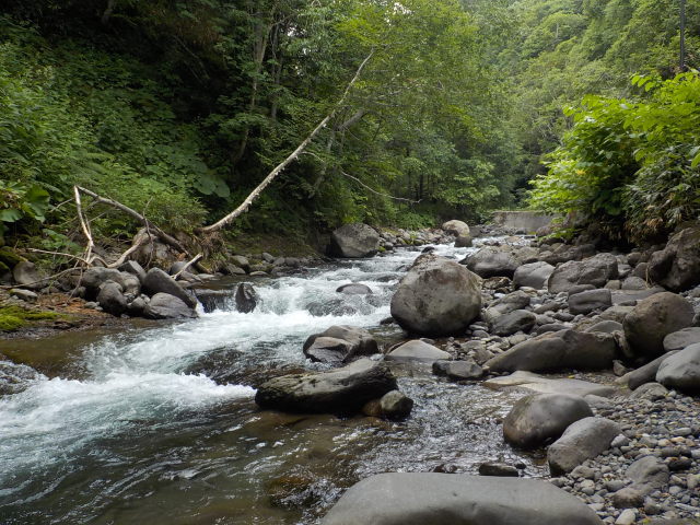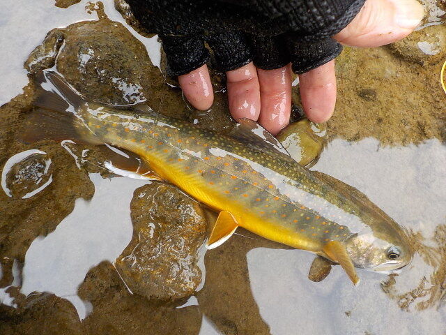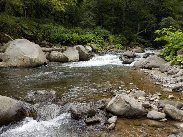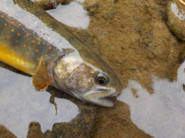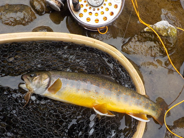 近くの空き地に車を駐めて、熊避け鈴とヘルメットを身につけて、12時30分頃、左岸より入渓する。白泡のキレ目に毛鉤を振ると、いきなりオショロコマがヒットした。