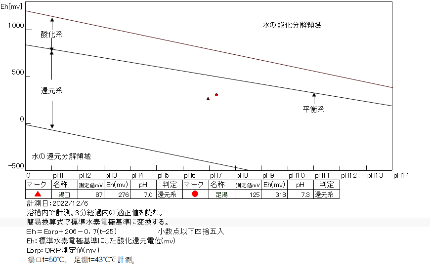 2022/12/6、9時40分~50分、浴槽内でORP計測(湯口はミニボトルで採水し、50℃で測定開始)。源泉掛け流しで、塩素系薬剤未使用。