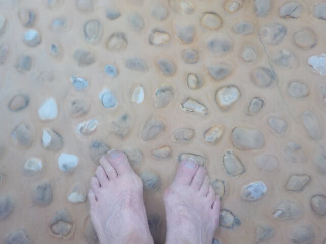 ほとんど無色透明の足湯。知覚的には、ほとんど無臭・弱塩味。注湯量は約20ℓ/分。溢れた湯は排湯口より排湯している。湯情報がないので加水しているのか不明。