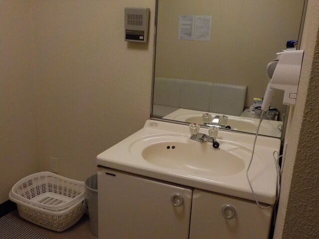 脱衣所には、トイレ、洗面台、ソファーがある。