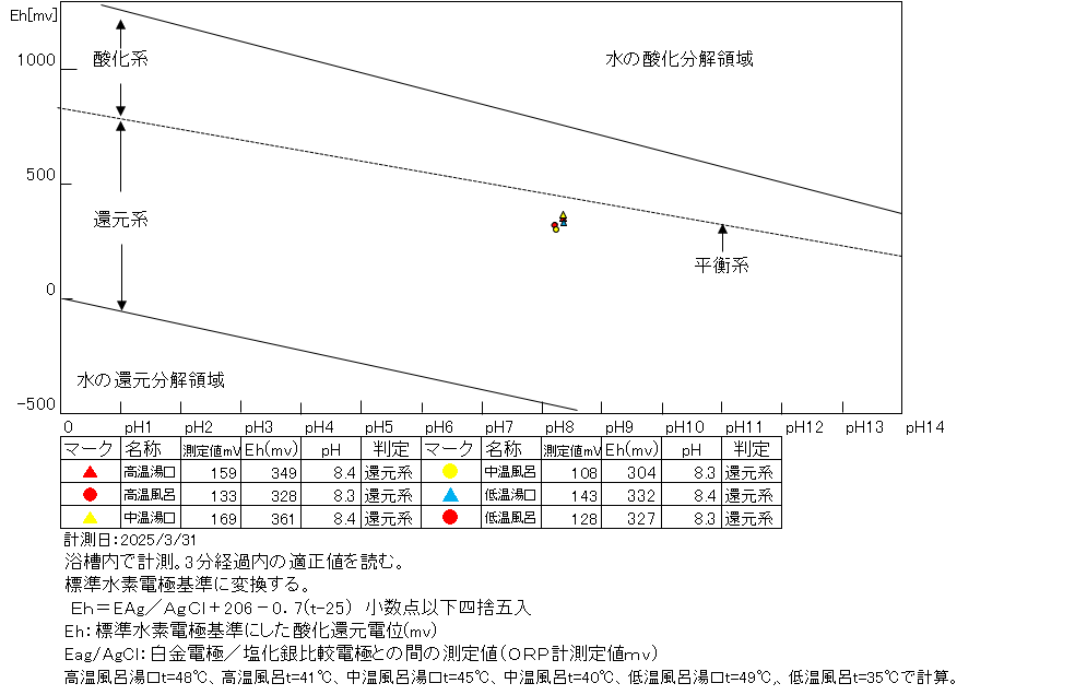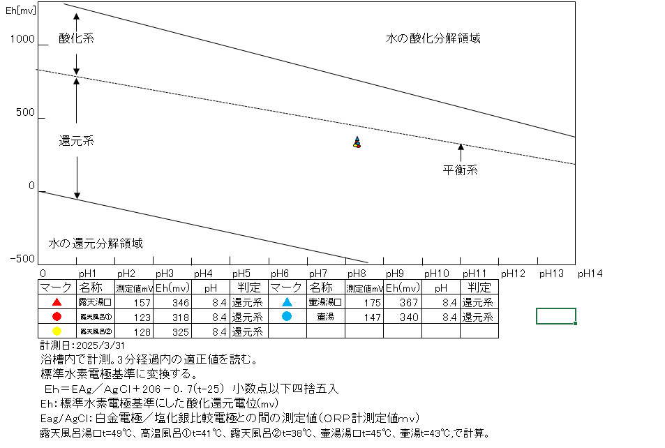 還元系にあり、温泉の鮮度は良好である。塩素系薬剤は未使用と思われる。