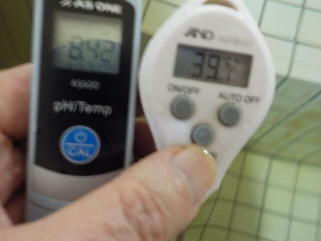 浴槽:温度39.3℃、pH8.42、ORP値は497mvに収束した。酸化系。