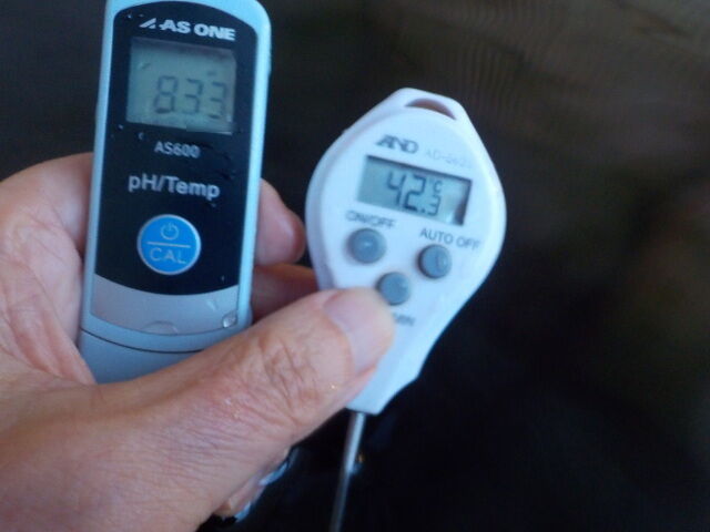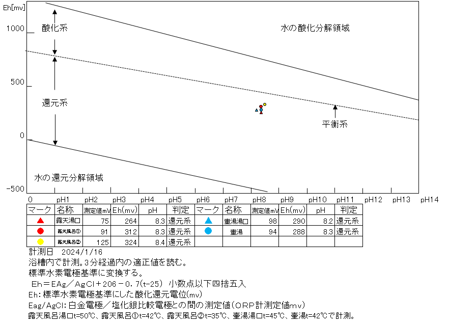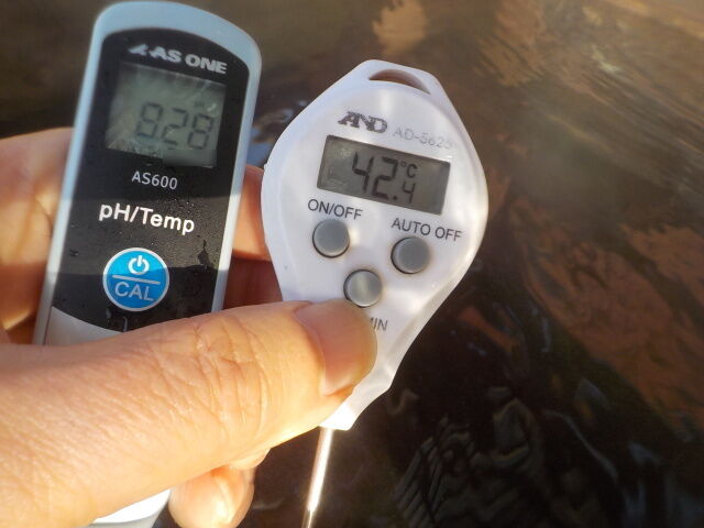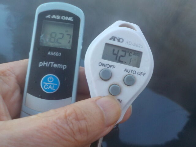 浴槽:温度42.1℃、pH8.27、ORP値は94mvに収束した。