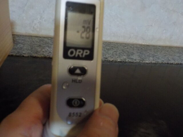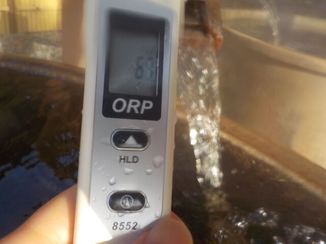 浴槽:温度38.2℃、pH8.54、ORP値は467mvに収束した。酸化系。