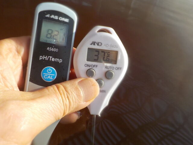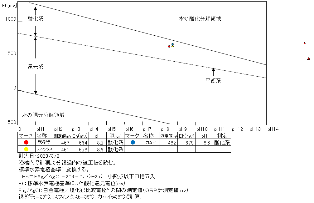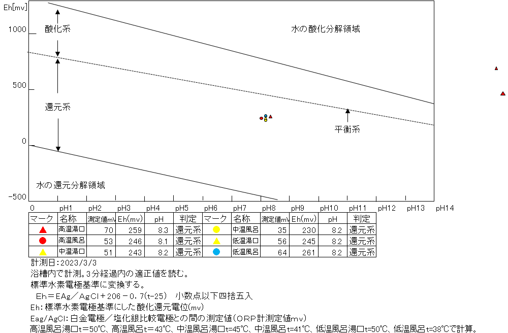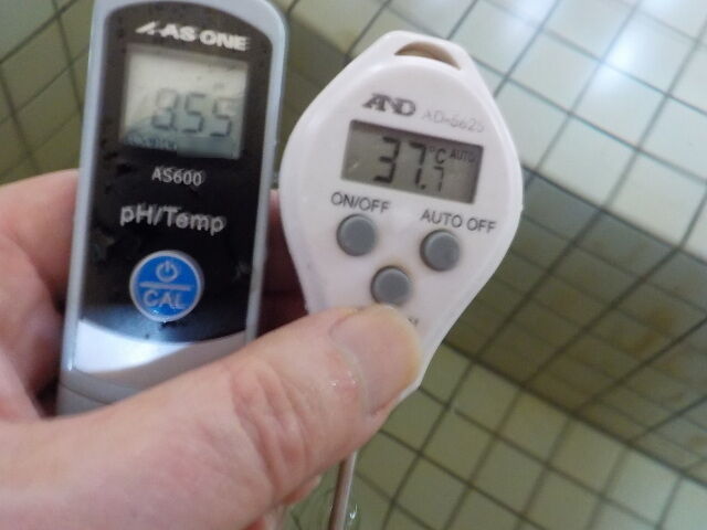 浴槽:温度37.7℃、pH8.55、ORP値は461 mvに収束した。酸化系。