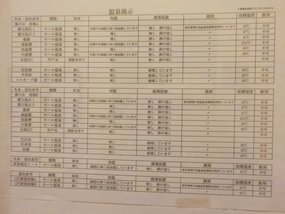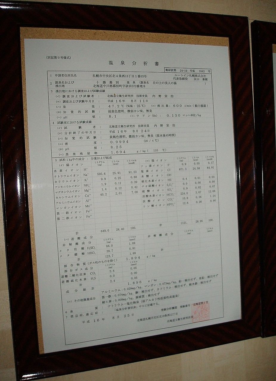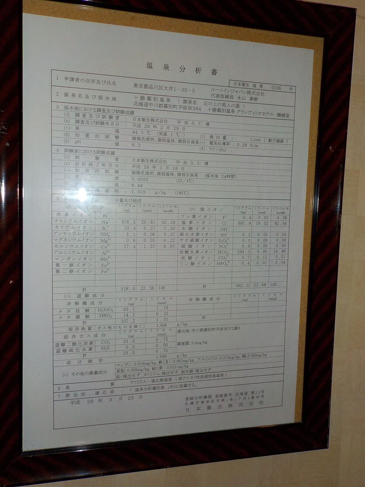 平成28年3月23日に作成した温泉分析書(日本衛生t株式会社)。泉温(機械室):44.0℃(気温:1℃)、湧出量:ℓ/分(動力揚湯)、pH値:8.3、溶存物質:1.566g/kg、成分総計:1.599g/kg、泉質:ナトリウム-塩化物泉(弱アルカリ性低張性高温泉)(旧泉質名:弱食塩泉)、腐植質3.0mg/kg