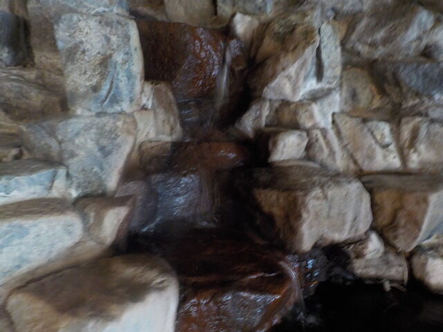 イカ墨を流したようなコーヒー色不透明の岩風呂。念入りに注湯口を探し回ると、入り口周辺と右側奥の岩の隙間に全部で3箇所の注湯口を確認。奥の右側湯口からの注湯量が一番多い。注湯量は全部で約30ℓ/分だろう。知覚的は硫化水素臭・微弱モール臭、微弱塩味。溢れた湯は露天風呂②に流れる。モール系のぬるりとした浴感で、場所によってはやや熱めの湯である。泡付きも確認できる。
