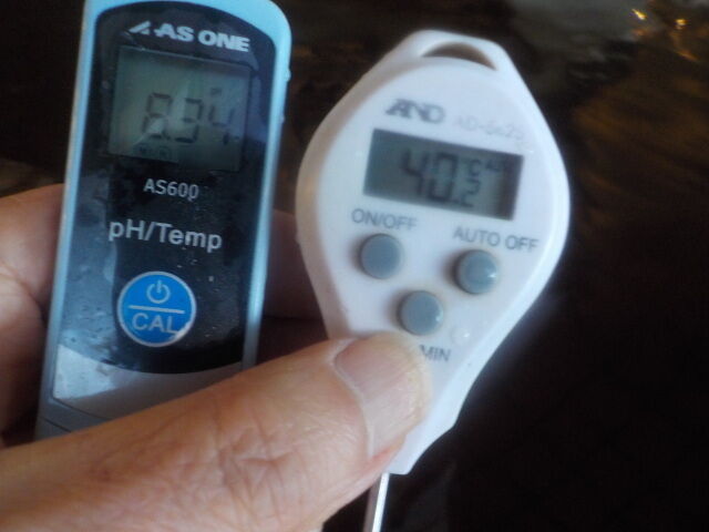 浴槽:温度40.2℃、pH8.34、ORP値は108mvに収束した。