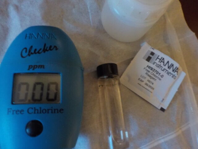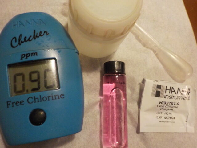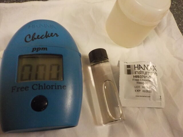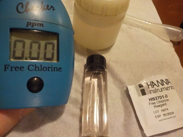 2024/1/15、23時頃、中温風呂で試料をミニボトルで採取し、遊離残留塩素測定器で遊離残留塩素濃度を測定。