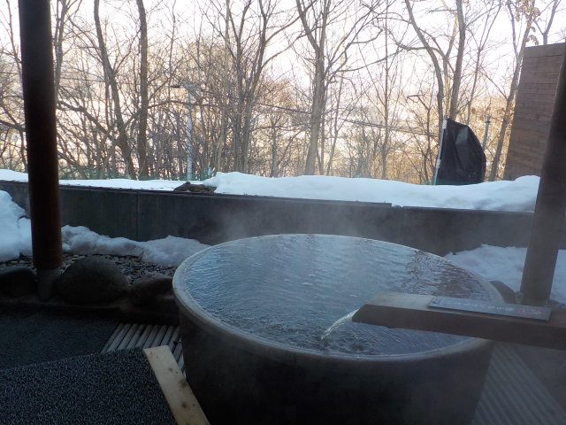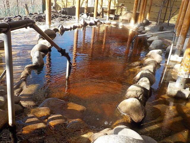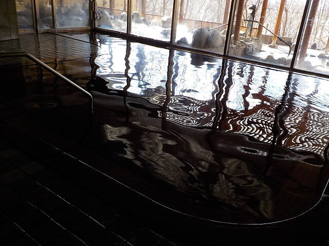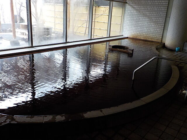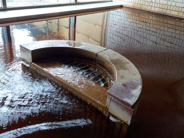 2021年から中温風呂に変更。コーヒー色半透明の湯。湯口の右側は浅湯になっている。注湯量は20ℓ/分。知覚的には、硫化水素臭・微弱モール臭、微弱塩味。溢れた湯は湯縁からオーバーフローしている。丁度良い湯温で、モール系のぬるめの湯でゆったりできる。