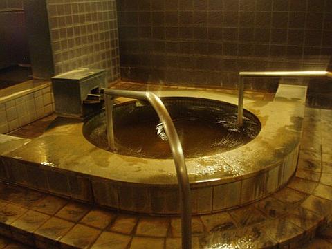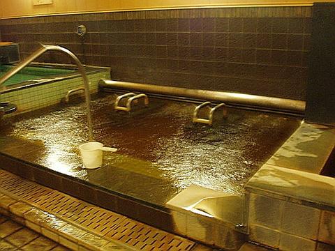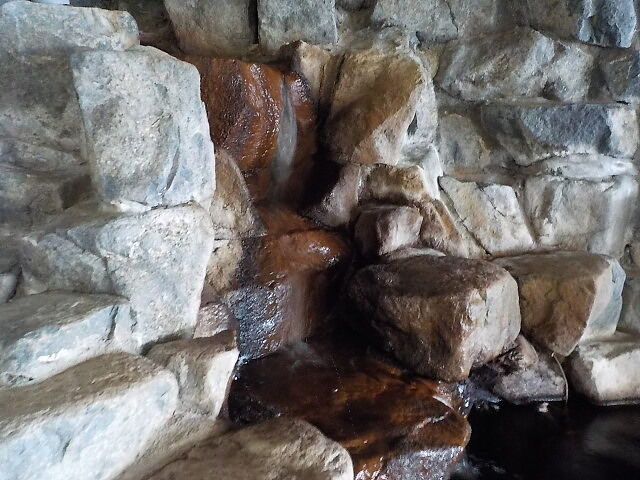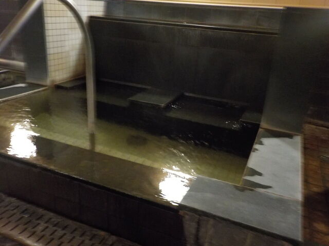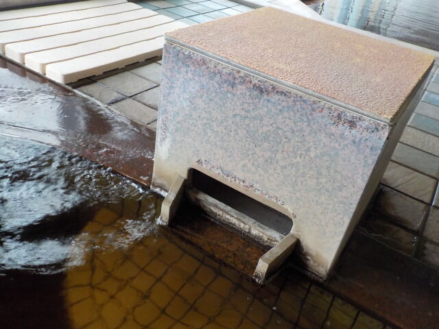 2021年から低温風呂に変更。コーヒー色半透明の湯。開業当時は湯口台からは湯が出ていたが、現在は使用していない。側壁湯口2箇所からトータルで約20ℓ/分注湯。溢れた湯は湯縁からオーバーフローしている。ぬるめの湯で、モール系のぬるりとした浴感あり。