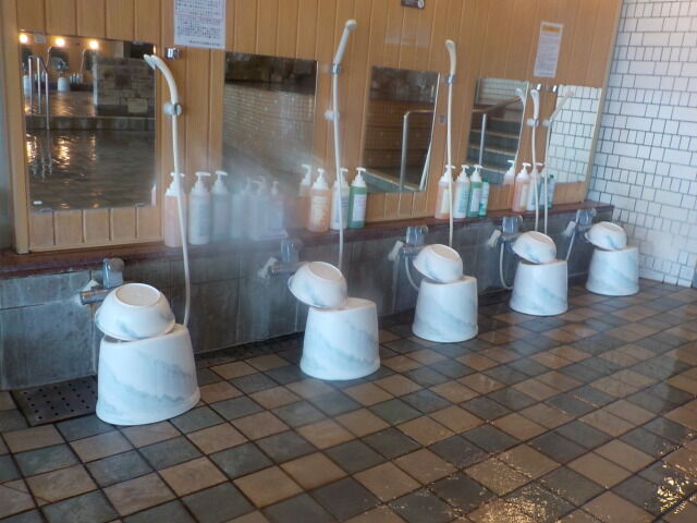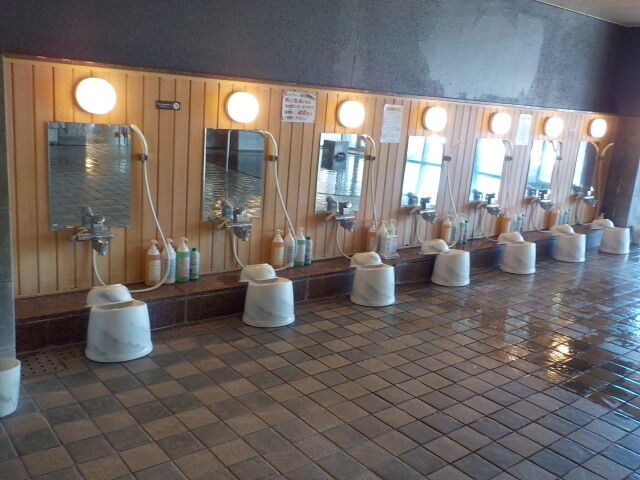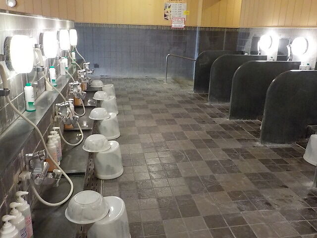 高温風呂、中温風呂、シャワー付カラン5台配置。シャンプー・コンディショナー・ボディソープあり。