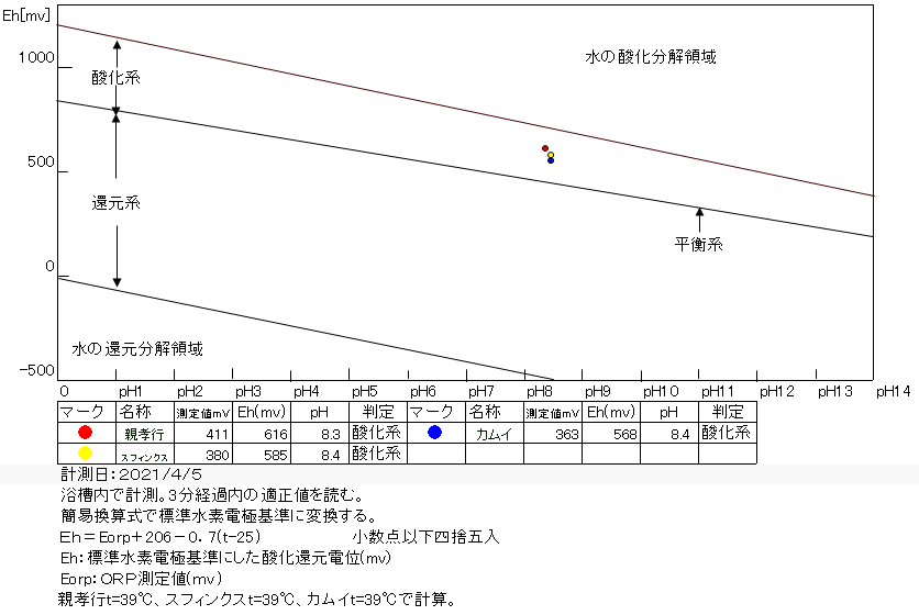 浴槽:温度39.1℃、pH8.41、ORP値は411mvに収束した。酸化系。