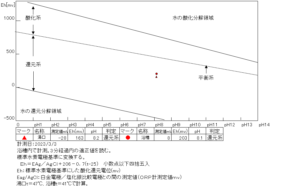 浴槽:温度42.4℃、pH8.28、ORP値は47mvに収束した。