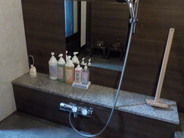 浴室に入ると数人が入れそうな浴槽。洗い場にシャワー付カラン1台。シャンプー・トリートメント・ボディソープあり。