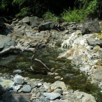 大船下の湯温泉の湯小屋から上流に向かって歩いていくと大船川の川縁に源泉が何箇所か湧出している。一般的には「大船川の湯」と呼ばれている。数十m離れたところには湯小屋に引湯している源泉沼がある。 硫黄臭が立ち込め、崖の岩肌は析出物が硬化してできた石灰華にな ...
