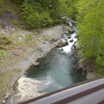 大雪湖に流入するホロカイシカリ川を湖畔橋より撮る。大雪湖はほぼ満水状態で湖畔橋上流にも流木が集まっていた。 銀泉台線は冬季間通行止になっている。左の空きスペースに車を駐めて、ヘルメット、熊避け鈴を身に付けてゲートから歩く。 道路の斜面は急勾配で川まで降 ...
