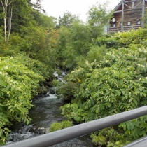 旭岳温泉の脇を流れるユコマンベツ川。向こうに見えるのは「ロッジ ヌタプカウシペ」。ヘルメットと熊避け鈴を身につけて、雲泉橋より入渓する。 ユコマンベツ川は温泉が入り込んでいるので生温かい。 白泡の切れ目に毛鉤を振ると、底岩から30cmの虹鱒が姿を現した ...