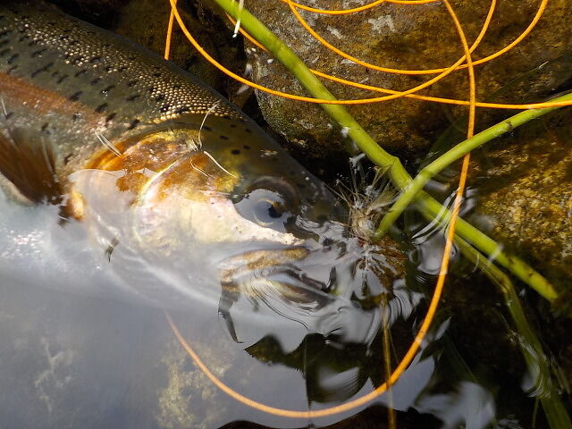 数メートル先のポイントに毛鉤を振ると、今度は水中の葦に逃げられたので水草の中から手づかみで30cmの虹鱒をキャッチした。