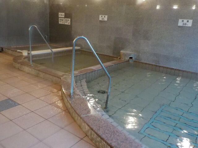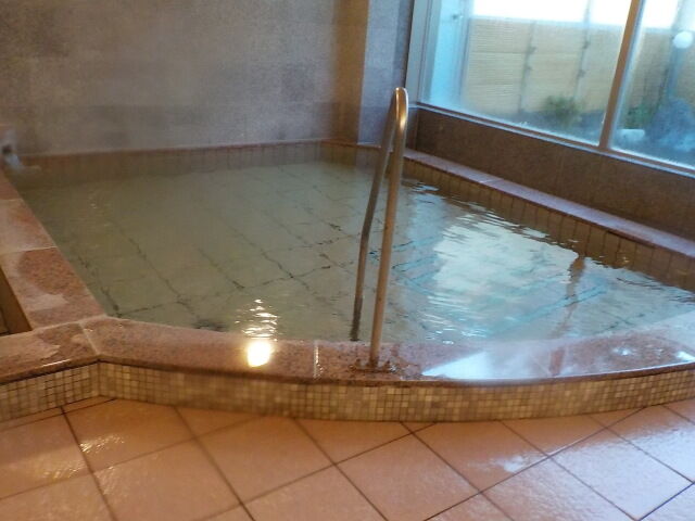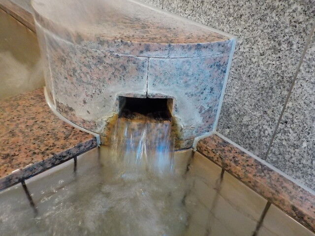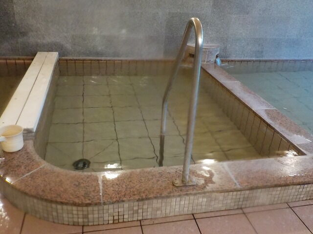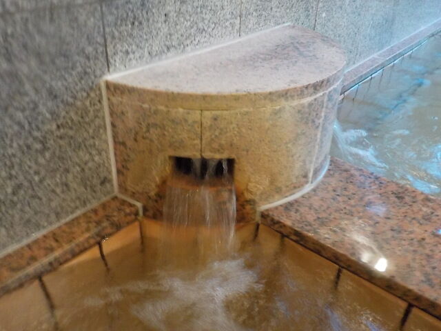ほとんど無色透明の湯。注湯量は約20ℓ/分。知覚的には、微弱臭素臭、塩味。溢れた湯は湯縁の隙間から排湯している。ややぬるめの湯である。高温湯、露天風呂と比べると、ORP値が高く、湯口温度が低く一定しないので、加水の疑義がある。