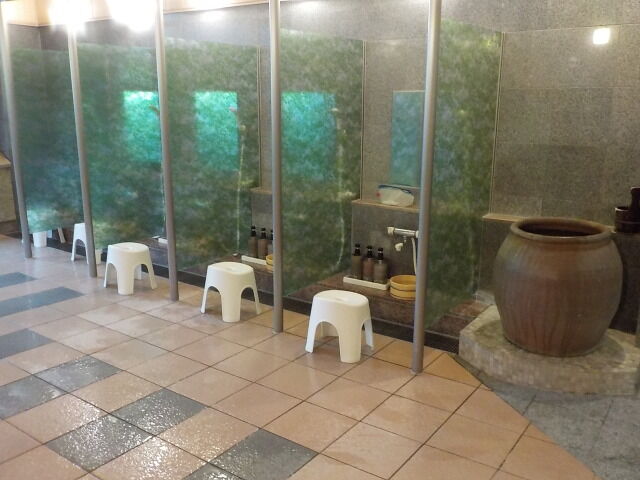 タイル張りの浴室に、高温湯、低温湯、サウナ、水風呂、上がり湯を配置。シャワー付カラン5台、シャンプー・ボディソープあり。