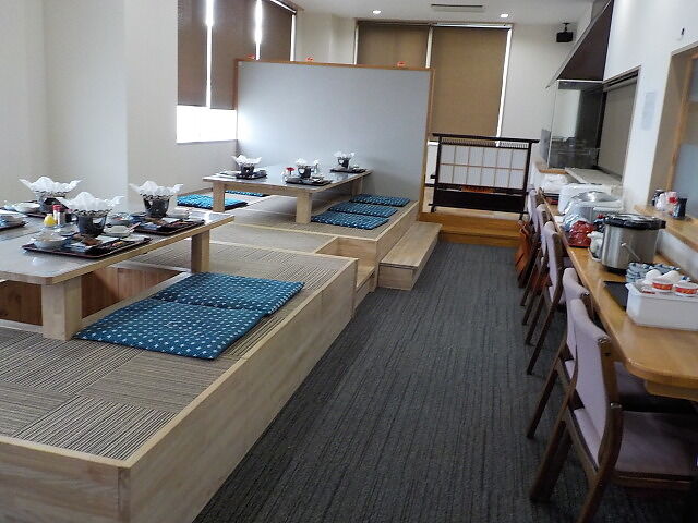 食事は1階居酒屋「舞酒」で頂く。朝食6時30分~9時。堀こたつの他に、テーブル席もある。