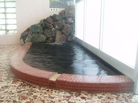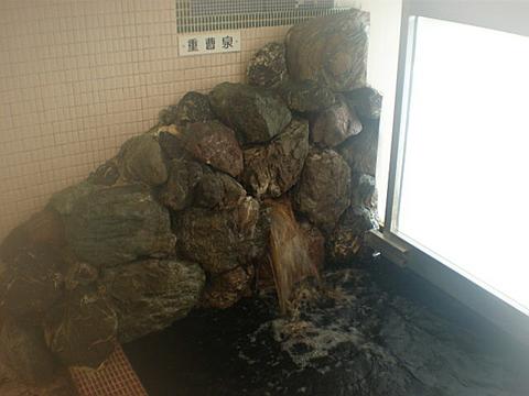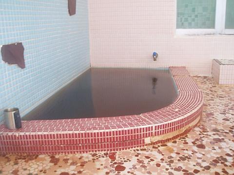 透明度は約5cm位でイカ墨を流したような黒湯。レトロな湯船は女湯との境に間仕切りがあるが、下は湯繋がりになっている。かつては混浴だったようだ。岩湯口から加熱循環湯が注いでいる。知覚的には、微弱鉱物臭・重曹味。側壁に循環吸込み口があり湯が吸込まれている。ぬるぬるした浴感は、まるで手に水掻きが付いたような錯覚すら覚える。