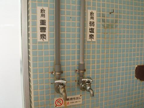 小浴槽の傍らに飲泉口。無断持ち出し禁止となっている。飲用重曹泉は微弱鉱物臭・重曹味。飲用弱塩泉はほとんど無臭・塩味。