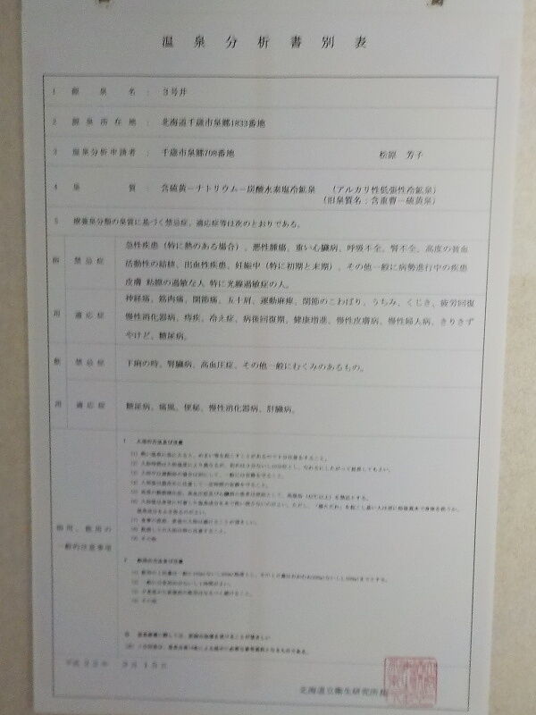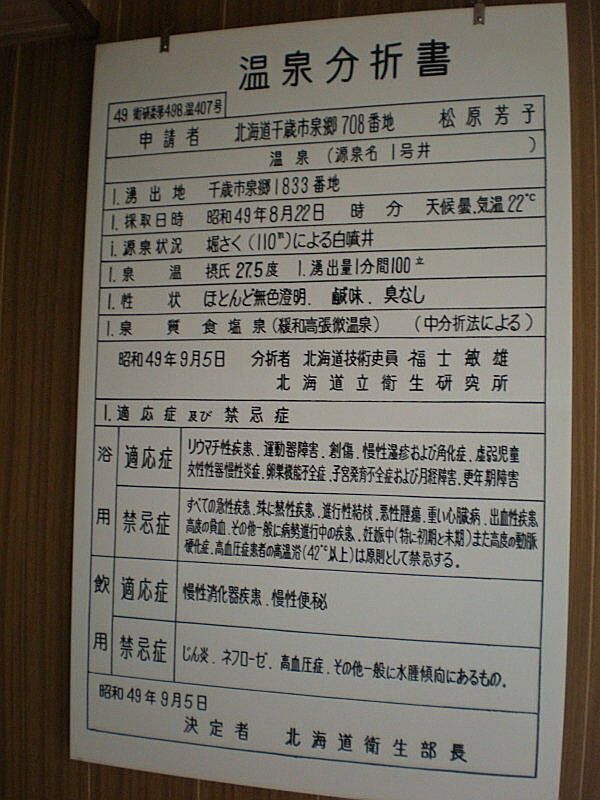 北海道千歳市「松原温泉旅館」~腐食質含有量 ... - さと太郎温泉.comに温泉分析書画像あり。