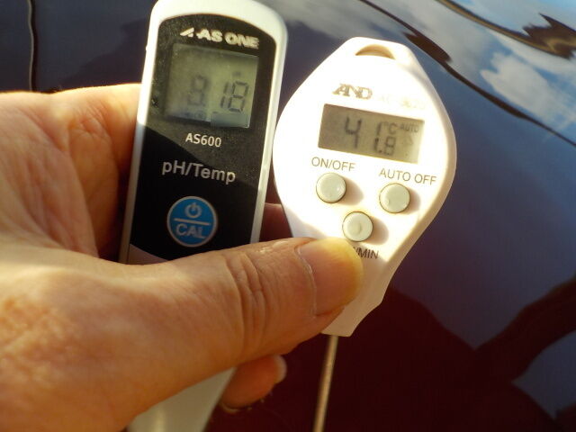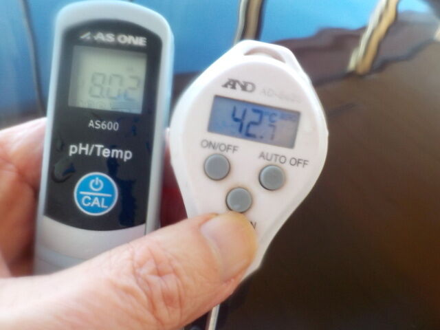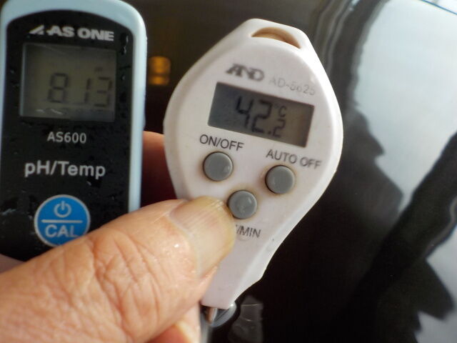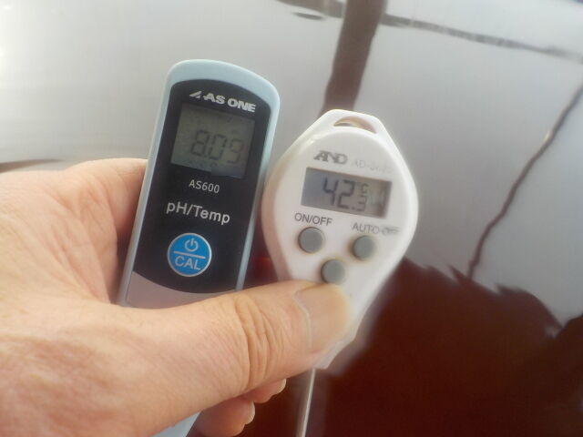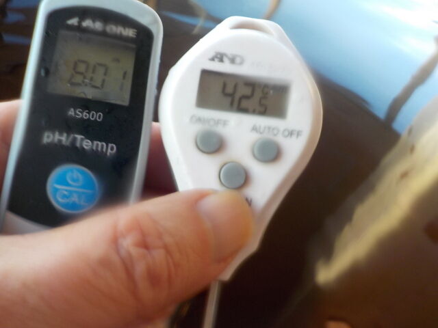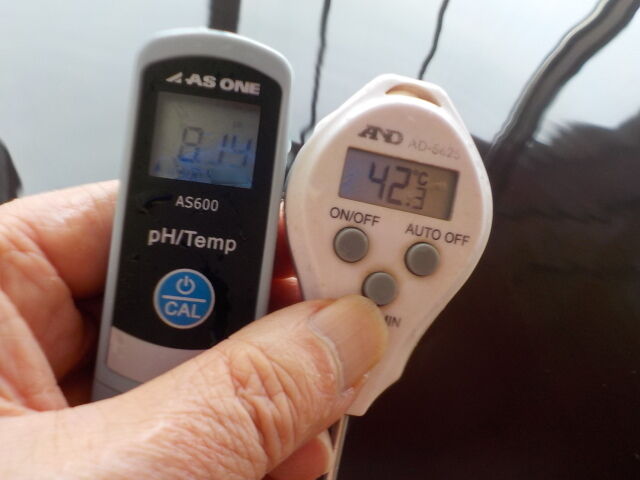浴槽:温度42.3℃、pH8.09、ORP値は76mvに収束した。