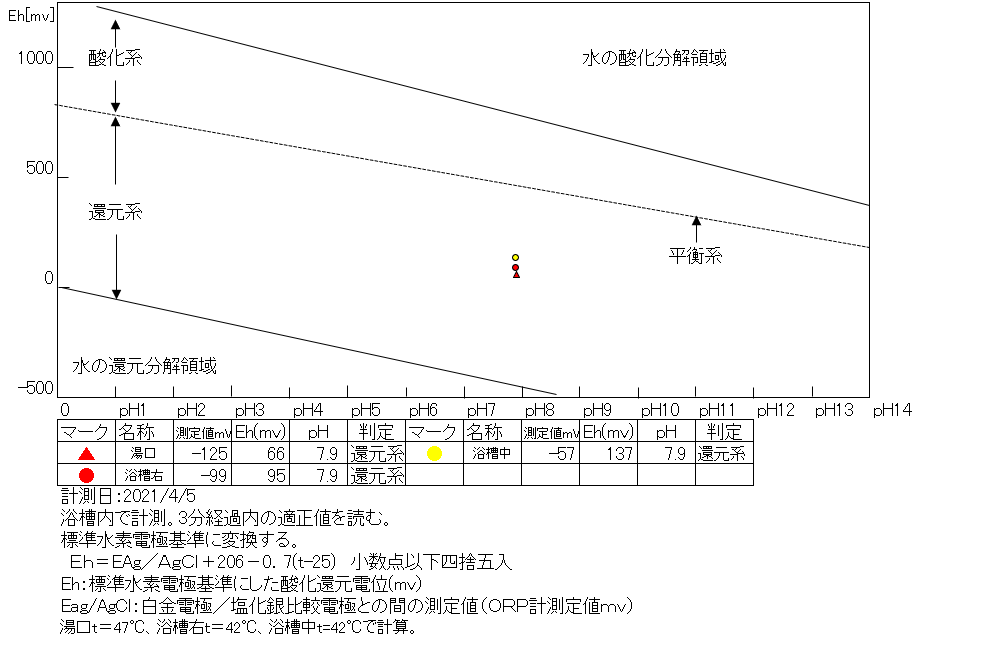 浴槽:温度42.1℃、pH7.91、ORP値は-99mvに収束した。