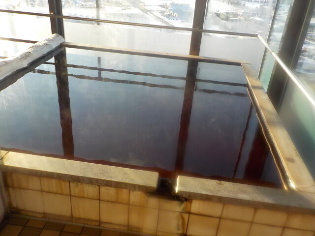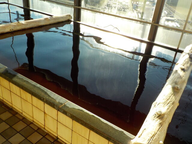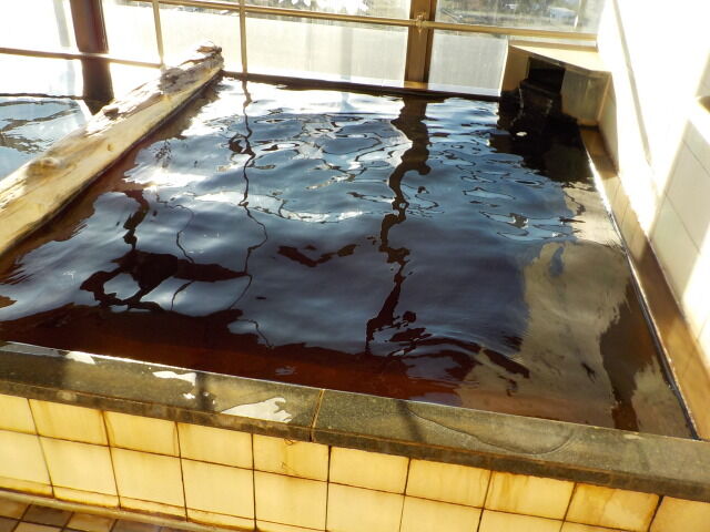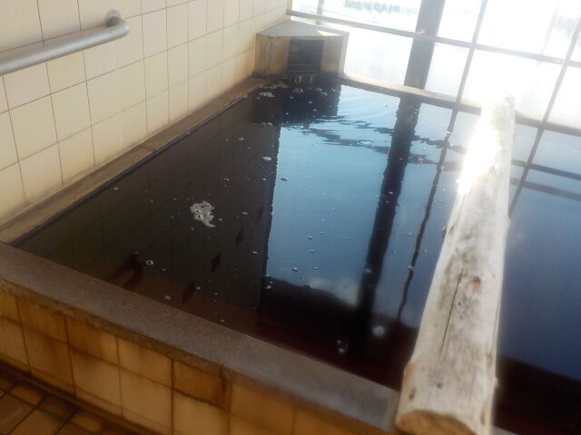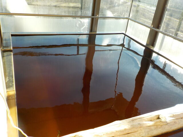 コーヒー色不透明の湯。知覚的には、モール臭、微弱塩味。腐植質系の湯の華が浮遊している。硫化水素臭よりもモール臭が強めに出ている。