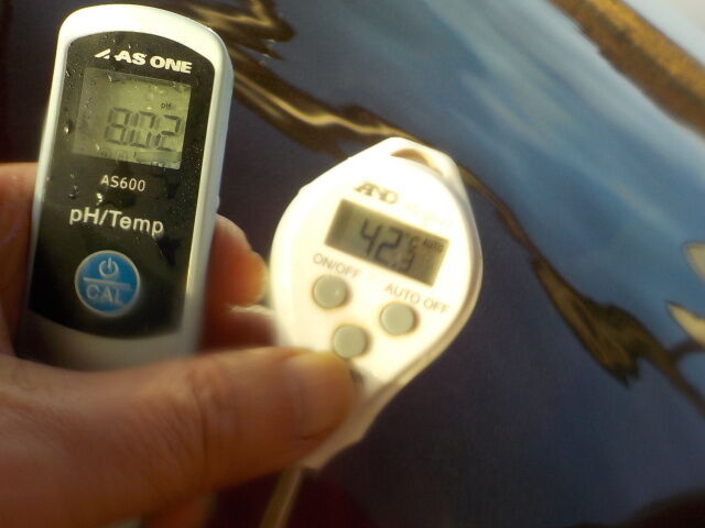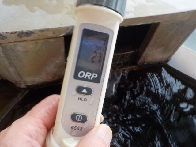 浴槽:温度42.7℃、pH8.02、ORP値は86mvに収束した。
