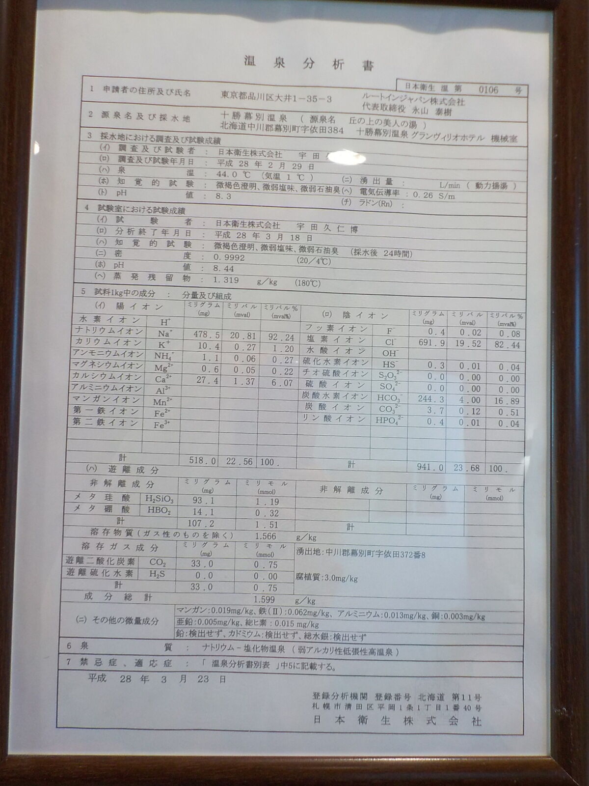 平成28年3月23日に作成した温泉分析書(日本衛生t株式会社)。泉温(機械室):44.0℃(気温:1℃)、湧出量:ℓ/分(動力揚湯)、pH値:8.3、溶存物質:1.566g/kg、成分総計:1.599g/kg、泉質:ナトリウム-塩化物泉(弱アルカリ性低張性高温泉)(旧泉質名:弱食塩泉)、腐植質3.0mg/kg