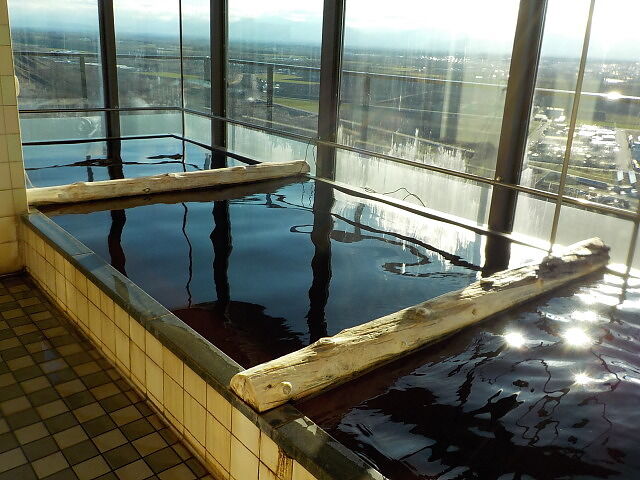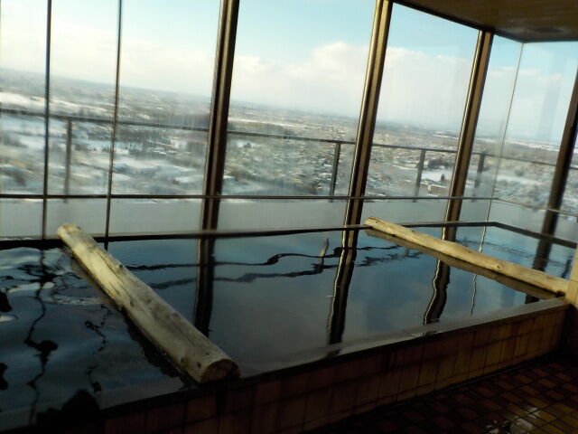 12階の展望風呂から十勝平野のパノラマが広がる。浴槽は3槽に仕切られているが、湯繋がりになっている。