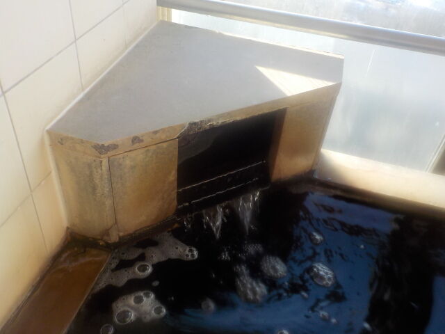 湯底はかさ上げして浅湯になっている。溢れた湯は湯縁からオーバーフローしている。